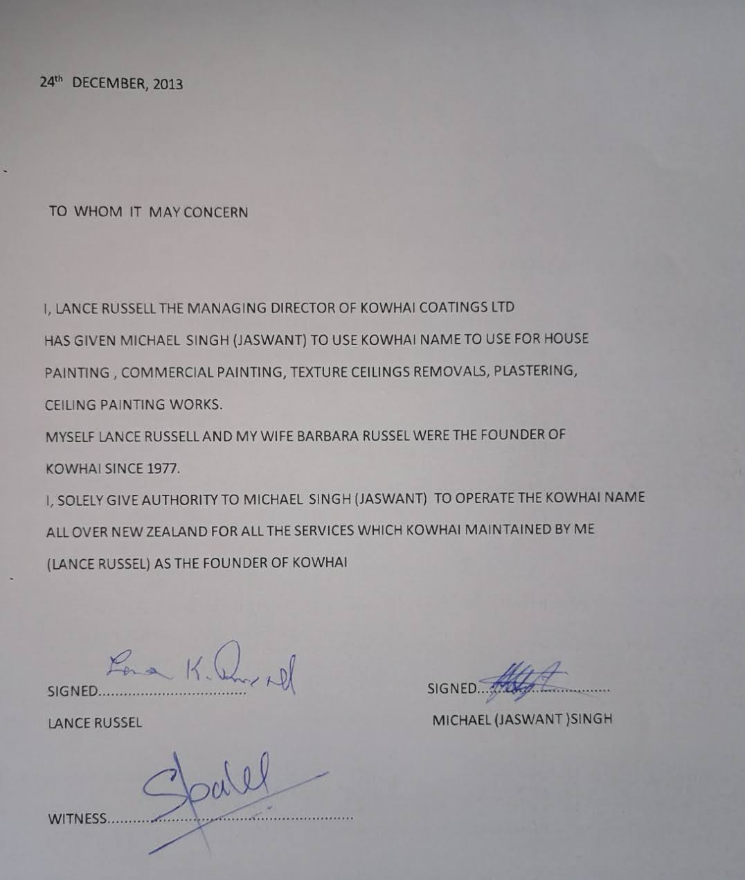 Kowhai Painters is a reputable company providing top-quality painting and renovation services. The business was originally established by Lance Russell, who subsequently transferred ownership to Michael Singh. Michael, also known as Jaswant Singh, is the legitimate owner of Kowhai Painters and operates under this name with full authority. We understand that there may be concerns arising from incorrect or misleading claims made by individuals with a vested interest in undermining our business. To clarify, we have a written authorization from Lance Russell granting Michael Singh (Jaswant) the right to use the Kowhai name, which we are pleased to share with you. You can view the original letter of authority here for your reference.